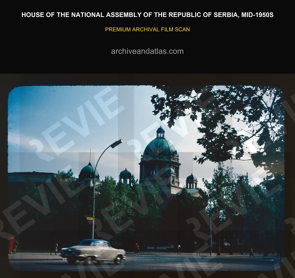 This primary-source 35mm slide scan, captured in the mid-1950s, offers a rare and moody view of the House of the National Assembly in Belgrade. Framed through the silhouettes of lush park trees, the image captures the architectural grandeur of the assembly’s domes contrasted against a cooling sky. A vintage mid-century vehicle in the foreground adds a sharp sense of motion and era-specific scale.